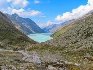 Bis zum hinteren Ende des Stausees, der Distelalp auf 2.224 m, können wir vom Campingplatz super mit den E-Bikes hochfahren, was uns ab dem Staudamm (dem größten Erddamm Europas) ein ganzes Stück Gehzeit erspart.