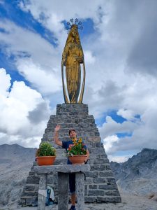 Während ich mir bei der fünf Meter hohen Madonna (2.858 m) ein regensicheres Plätzchen suche, bewältigt Roli noch schnell die letzten 130 Höhenmeter auf den Gipfel des Monte Moro (2.984 m).