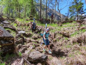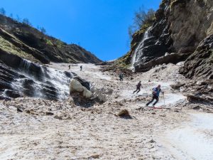 Vor allem im ersten Teil der rund 1.700 m langen Abfahrt hatten wir perfekte Firnbedingungen. Im zweiten Teil entlang des Pfandlbachs mussten wir dann etwas mehr aufpassen und schauen, da die Spur enger und das tosende Wasser immer lauter wurde. Dennoch ging es bestens zum Durchnavigieren.