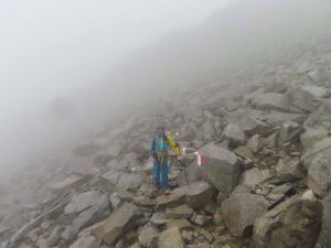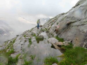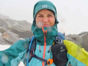 Zweiter Versuch, 20. Juli 2024. Die Bedingungen? Wechselhaft, laut Wetterbericht mit einer 50:50-Prognose, dass es „aufreißen könnte“. Beim Weggehen frühmorgens im Regen waren wir noch voller Hoffnung und optimistisch. Beim Zustieg war diese Zuversicht verschwunden: Keine Sicht auf Besserung, nasser Fels und bald auch eine durchnässte Simone und ein durchnässter Roli. Also wieder einmal Rückzug. Bei unserer kleinen Nachmittagstour auf die Bachmayrspitze (Schwarzes Hendl) – nachdem sich das Wetter irgendwann doch noch gebessert hat – wurden wir dafür mit einem großen Rudel Steinböcke belohnt.